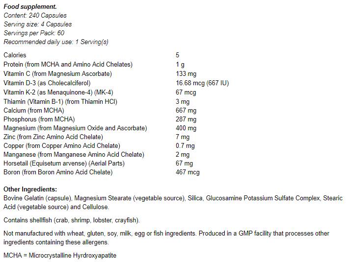 NOW® Ενδυνάμωση των Οστών περιέχει μικροκρυσταλλικό Υδροξυαπατίτης (MCHA) – ένα εντελώς φυσικό συστατικό που χτίζει την κρυσταλλική δομή των οστών και των δοντιών. MCHA είναι πηγή εξαιρετικά απορροφήσιμων μετάλλων όπως το ασβέστιο και ο φώσφορος, τα οποία είναι τα κύρια δομικά στοιχεία των οστών. Το NOW® Bone Strength™ περιέχει ιχνοστοιχεία και βιταμίνες C, D και K, τα οποία εμπλέκονται στις διαδικασίες οικοδόμησης και ανανέωσης του οστικού ιστού.