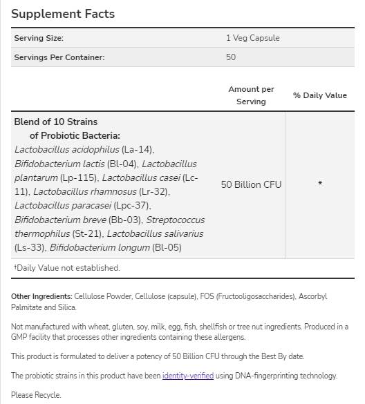 Το Probiotic-10 50 Billion είναι μια ισχυρή φόρμουλα που συνδυάζει 10 διαφορετικά στελέχη προβιοτικών, παρέχοντας 50 δισεκατομμύρια ενεργές καλλιέργειες προβιοτικών ανά μερίδα. Αυτά τα προβιοτικά παίζουν βασικό ρόλο στη διατήρηση της υγιούς εντερικής χλωρίδας, η οποία είναι απαραίτητη για την κανονική λειτουργία της πεπτικής μας υγείας.