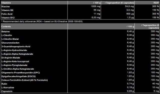 Η ορνιθίνη, το κετογλουταρικό, το πυρογλουταμινικό, η κιτρουλίνη, η φορσκολίνη, η καψακαϊνη και η ρουτίνη βελτιστοποιούν και αυξάνουν το επίπεδο αργινίνης στο αίμα, και μέσω της OPC, των πολυφαινολών και της νορβαλίνης (μεταβολικός ρυθμιστής) σταθεροποιείται περαιτέρω.
