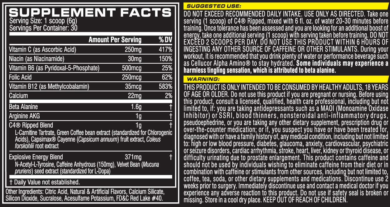 C4 Ripped Blend είναι ένας τέλεια ισορροπημένος συνδυασμός ενεργών συστατικών που χαρίζουν εκρηκτική ενέργεια και καίνε το λίπος άμεσα!