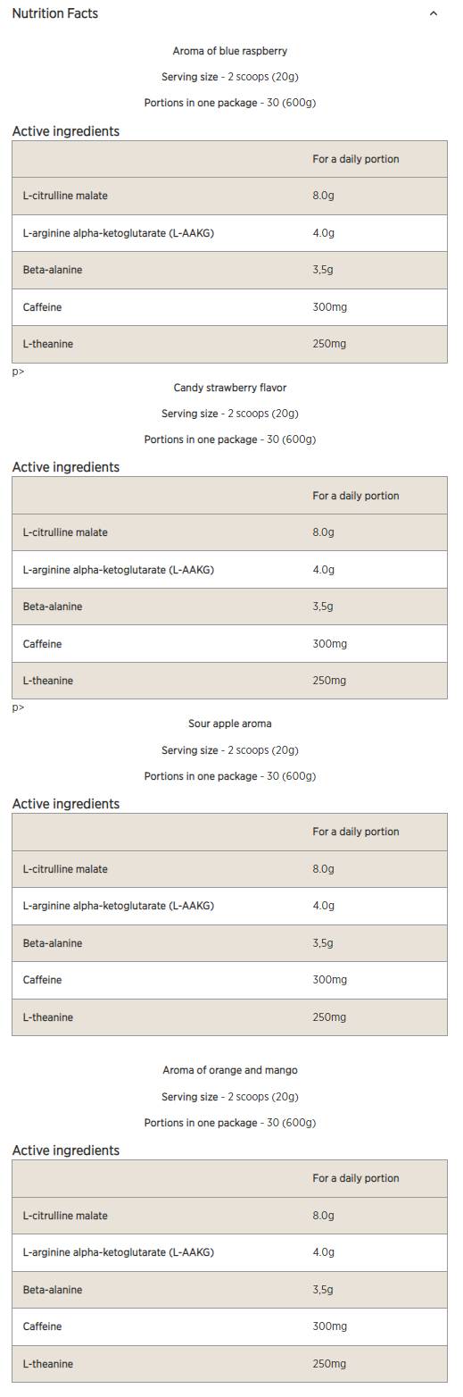 Επιπλέον, έχουμε προσθέσει μια σειρά από γνωστά και καλά ερευνημένα συστατικά, όπως 8mg μηλικής κιτρουλίνης, 3,5g βήτα-αλανίνης, 4g άλφα-κετογλουταρικής L-αργινίνης και τέλος 250mg L-θεανίνης.