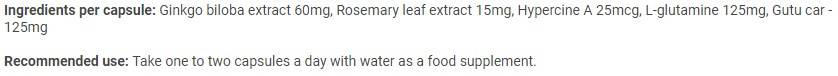 Το δεντρολίβανο, που προστίθεται στη σύνθεση, είναι γνωστό για τα λιποδιαλυτά αντιοξειδωτικά του που βοηθούν στην εξουδετέρωση των ελεύθερων ριζών στο σώμα. Αυτό το καθιστά εξαιρετικό σύμμαχο για τη βελτίωση της λειτουργίας του εγκεφάλου. Το εκχύλισμα Ginkgo Biloba βελτιώνει την κυκλοφορία του αίματος στον εγκεφαλικό ιστό, γεγονός που οδηγεί σε καλύτερη πρόσβαση οξυγόνου και θρεπτικών συστατικών στα κύτταρα. Επιπλέον, το Gotu Kola βοηθά στη βελτίωση της κυκλοφορίας του αίματος στον εγκέφαλο, η οποία είναι απαραίτητη για τη μνήμη και τη συγκέντρωση.