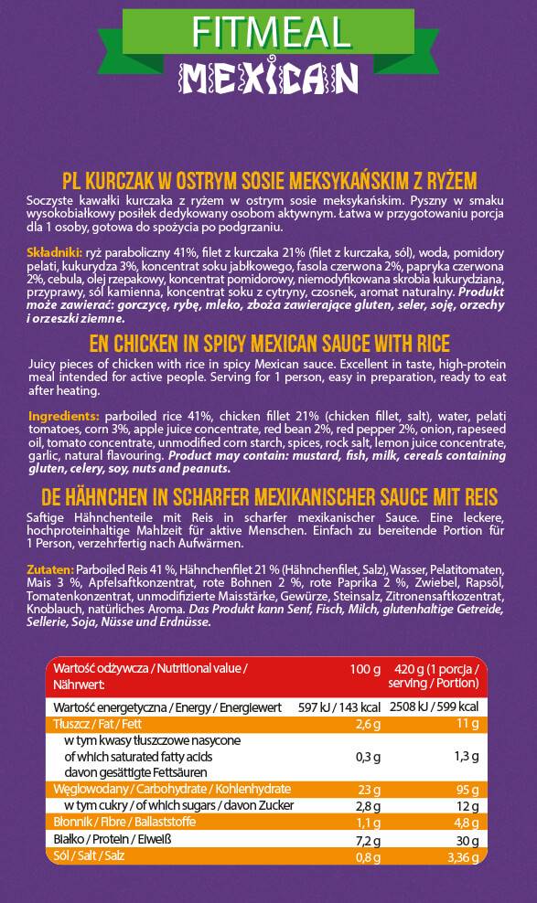 Το FitMeal Mexican είναι ένα προϊόν της κορυφαίας μάρκας για υγρά συμπληρώματα διατροφής, η οποία προσφέρει έτοιμη τροφή με υψηλή περιεκτικότητα σε πρωτεΐνες. Η περιεκτικότητα σε γρήγορες πρωτεΐνες σε συνδυασμό με νόστιμα μεξικάνικα μπαχαρικά, καθιστά αυτό το πιάτο όχι μόνο θρεπτικό, αλλά και εξαιρετικά νόστιμο. Η υψηλή περιεκτικότητα σε πρωτεΐνες υποστηρίζει τη μυϊκή μάζα και επιταχύνει την αποκατάσταση μετά την προπόνηση, κάτι που είναι επιστημονικά αποδεδειγμένο. Το προϊόν είναι ιδανικό για άτομα που ακολουθούν έναν ενεργό τρόπο ζωής και αναζητούν έναν γρήγορο και εύκολο τρόπο να τρώνε χωρίς συμβιβασμούς στην ποιότητα.