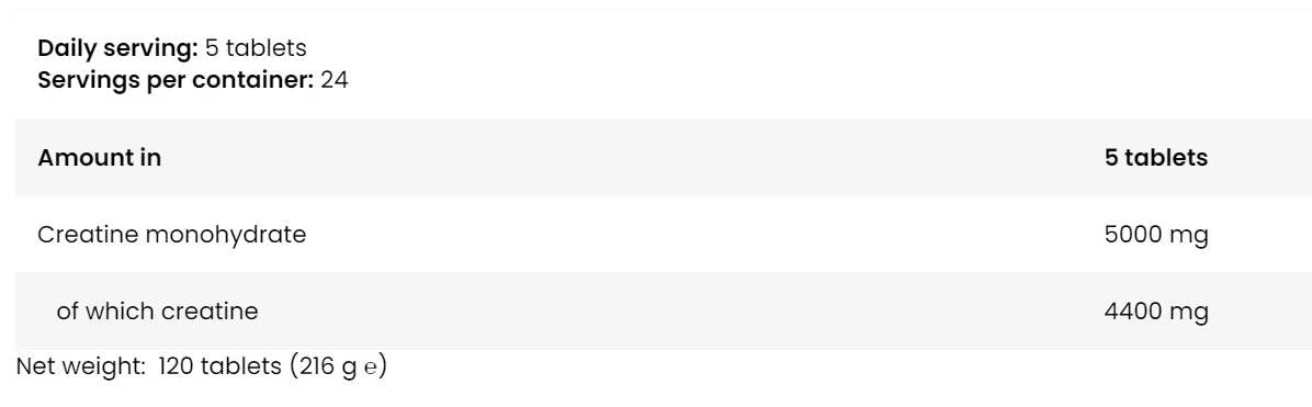 Η μονοϋδρική κρεατίνη είναι το κύριο συστατικό του συμπληρώματος, το οποίο βοηθά στην αύξηση της δύναμης, της ισχύος και της μυϊκής αντοχής. Η κρεατίνη είναι επίσης χρήσιμη για την αύξηση της μυϊκής μάζας.