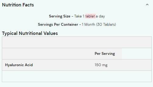 Το υαλουρονικό οξύ έχει συμμετάσχει σε κλινικές μελέτες σχετικά με τη γήρανση του δέρματος, όπου η χορήγηση συμπληρωμάτων για οκτώ εβδομάδες μείωσε την εμφάνιση των ρυτίδων. Με μια εξαιρετικά συμπυκνωμένη σύνθεση, τα δισκία υαλουρονικού οξέος μας είναι σχεδιασμένα με εξειδίκευση για να υποστηρίζουν τα φυσικά μας επίπεδα καθώς μεγαλώνουμε.