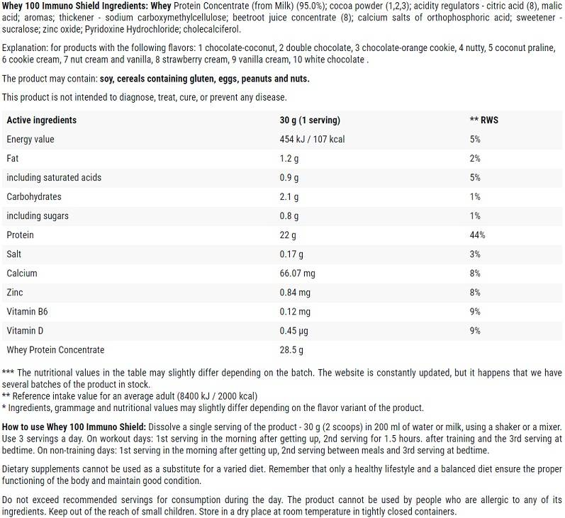 Trec Nutrition Ορός γάλακτος 100 είναι ένα φανταστικό συμπλήρωμα που παρέχει τα απαραίτητα θρεπτικά συστατικά όταν το σώμα τα χρειάζεται περισσότερο, δηλαδή στον επαγγελματικό αθλητισμό, κατά τη διάρκεια δίαιτας χαμηλών θερμίδων (κατά τη διάρκεια περιόδων απώλειας λίπους) και ανάρρωσης. Το προϊόν συνιστάται ιδιαίτερα για την απόκτηση άπαχης μυϊκής μάζας και για ταχύτερη αποκατάσταση .