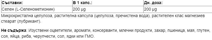 Σελήνιο από φυσική πηγή με τη μορφή L-σεληνομεθειονίνης ή Se-Met – ένα φυσικό αμινοξύ που, σε σύγκριση με άλλες μορφές σεληνίου, απορροφάται πολύ πιο εύκολα και παραμένει στον οργανισμό για μεγαλύτερο χρονικό διάστημα. Η σύνθεση του σεληνίου (L-σεληνομεθειονίνη) είναι πιστοποιημένη από την ISURA, η οποία εγγυάται την απουσία ΓΤΟ, φυτοφαρμάκων, διαλυτών κ.λπ.! Με πιστοποιητικό από την GFCO ότι δεν περιέχει γλουτένη. Με χαρακτηρισμό NPN (Natural Product Number) – αδειοδοτημένο και αξιολογημένο ως ασφαλές, αποτελεσματικό και υψηλής ποιότητας από την Health Canada!
