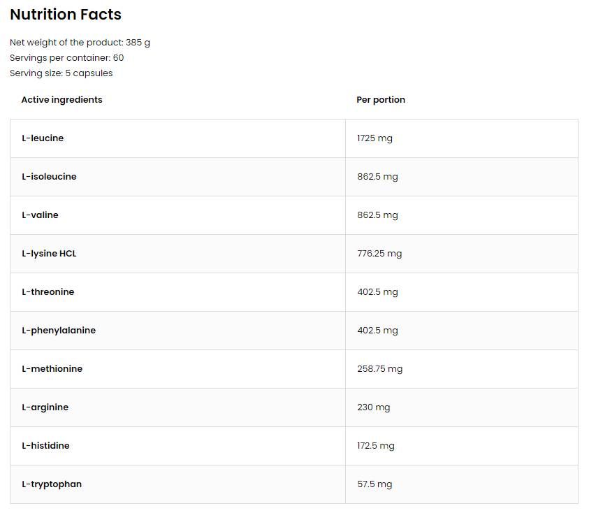 Η σύνθεση του προϊόντος περιλαμβάνει Σύμπλεγμα BCAA , δηλαδή τρία αμινοξέα μακράς αλυσίδας: λευκίνη, βαλίνη και ισολευκίνη και επιπλέον ενώσεις όπως: λυσίνη, θρεονίνη, φαινυλαλανίνη, μεθειονίνη, αργινίνη, ιστιδίνη και τρυπτοφάνη.