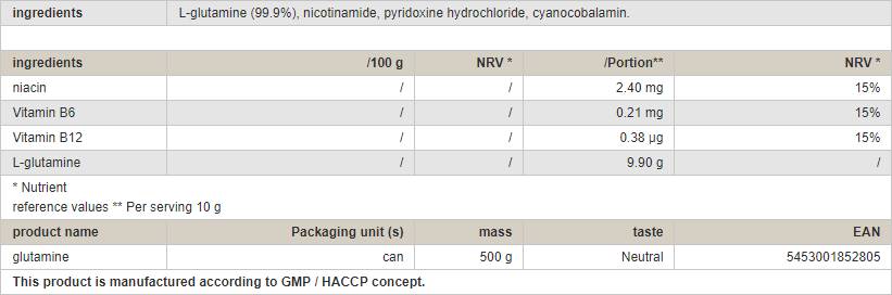 Οδηγίες χρήσης: L-Γλουταμίνη - 10 g (περίπου 1 κουταλιά της σούπας) διαλυμένη σε υγρό, κατά προτίμηση αμέσως μετά την προπόνηση.
