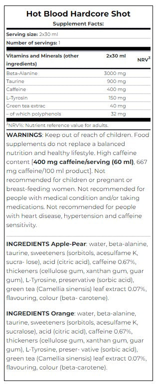 SCITEC Το Hot Blood Hardcore είναι ένα προπροπονητικό συμπλήρωμα που συνδυάζει ισχυρά ενεργά συστατικά σχεδιασμένα να αυξάνουν την μυϊκή ώθηση, την αντοχή και την ενέργεια κατά τη διάρκεια έντονης σωματικής άσκησης. Η φόρμουλα περιλαμβάνει κρεατίνη, η οποία είναι ένα βασικό συστατικό για την αύξηση της ενεργειακής χωρητικότητας και της σύνθεσης ATP στα μυϊκά κύτταρα.