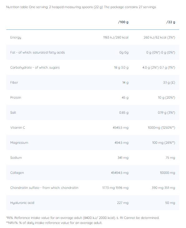 Προσθέσαμε επίσης 390 mg θειικής χονδροϊτίνης ανά μερίδα, η οποία υποστηρίζει την απορρόφηση του κολλαγόνου και του υαλουρονικού οξέος και διατηρεί την υγεία και την ενυδάτωση των αρθρώσεων και των χόνδρων. Τέλος, συμπληρώσαμε το προϊόν με εκχύλισμα ρίζας ashwagandha, το οποίο μπορεί να έχει θετική επίδραση στη συγκέντρωση, ενώ παράλληλα συμβάλλει στην αναγέννηση χαλαρώνοντας τους μύες.