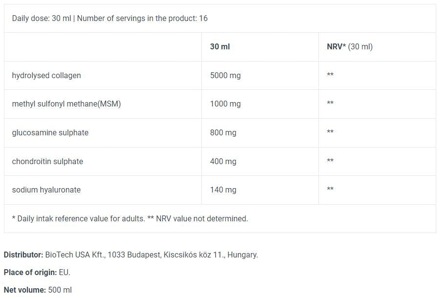 BioTech USA Arthro Forte Υγρό/500 ml είναι ένα υψηλής ποιότητας συμπλήρωμα διατροφής που περιέχει ένα σύμπλεγμα δραστικών συστατικών που έχουν σχεδιαστεί για τη διατήρηση της υγείας των αρθρώσεων, των τενόντων και των χόνδρων. Αυτό το προϊόν έχει σχεδιαστεί για να ενισχύει τις διαδικασίες αποκατάστασης, να ανακουφίζει από τον πόνο και να παρουσιάζει ισχυρή αντιφλεγμονώδη δράση.