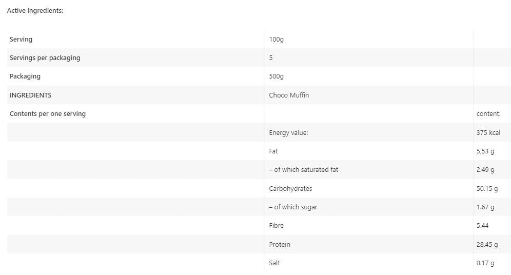 Το muffin σοκολάτας με υψηλή περιεκτικότητα σε πρωτεΐνη είναι η ιδανική επιλογή για όποιον θέλει να αυξήσει την ημερήσια πρόσληψη πρωτεΐνης με έναν νόστιμο τρόπο. Αυτό το προϊόν είναι ιδανικό τόσο για ενεργούς αθλητές όσο και για άτομα που απλώς θέλουν να διατηρούνται σε φόρμα και υγιείς. Η υψηλή περιεκτικότητα σε πρωτεΐνη βοηθά στην ανάπτυξη μυών και στην αποκατάσταση μετά την άσκηση, προσφέροντας παράλληλα την απόλαυση της γεύσης σοκολάτας.
