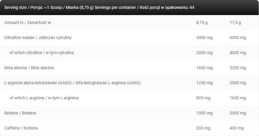Αργινίνη άλφα-κετογλουταρικό είναι ένα αμινοξύ που διεγείρει την παραγωγή μονοξειδίου του αζώτου στο σώμα και βελτιστοποιεί τη μεταφορά θρεπτικών συστατικών στο σώμα επειδή διαστέλλει τα αιμοφόρα αγγεία. Βελτιώνει την άντληση των μυών και παρέχει εκρηκτική δύναμη.
