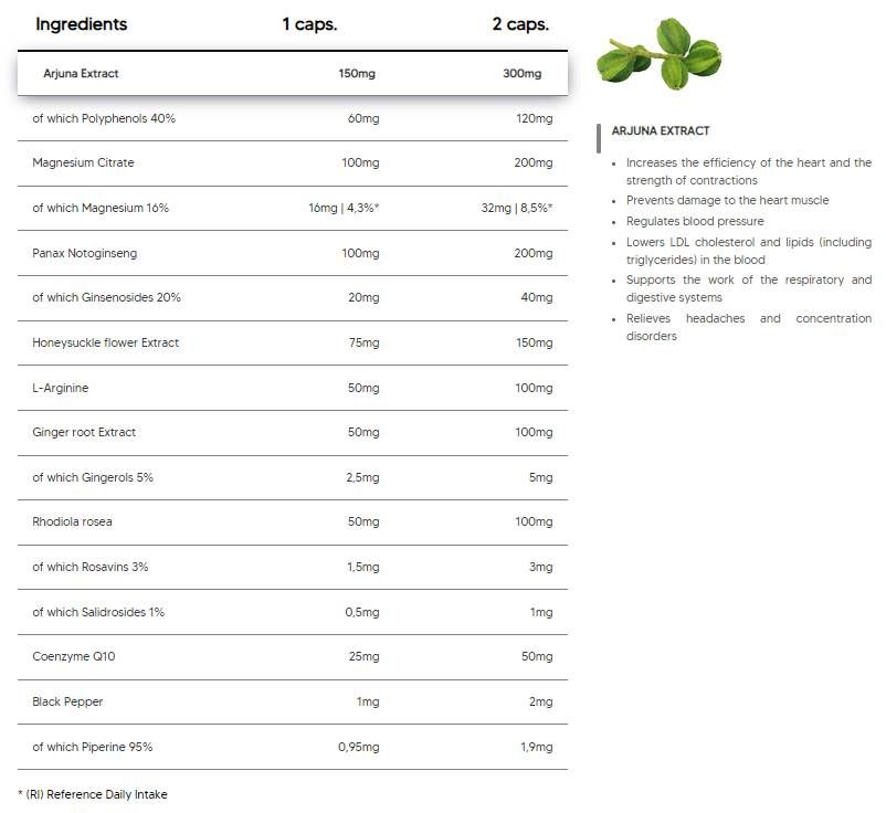 Εκχύλισμα Arjuna (Terminalia arjuna· εκ των οποίων 40% πολυφαινόλες), συστατικά κάψουλας: κυτταρίνη, κιτρικό μαγνήσιο (εκ των οποίων 16% μαγνήσιο), εκχύλισμα Panax Notoginseng (Burkill FHChen· εκ των οποίων 20% τζινσενοσίδες), εκχύλισμα άνθους αγιόκλημα (4:1), L-αργινίνη, εκχύλισμα ρίζας τζίντζερ (Zingiber officinale· εκ των οποίων 5% τζίντζερ), εκχύλισμα Rhodiola rosea (εκ των οποίων 3% rOsavins, 1% σαλιδροσίδες), συνένζυμο Q10 (ουβικινόλη).