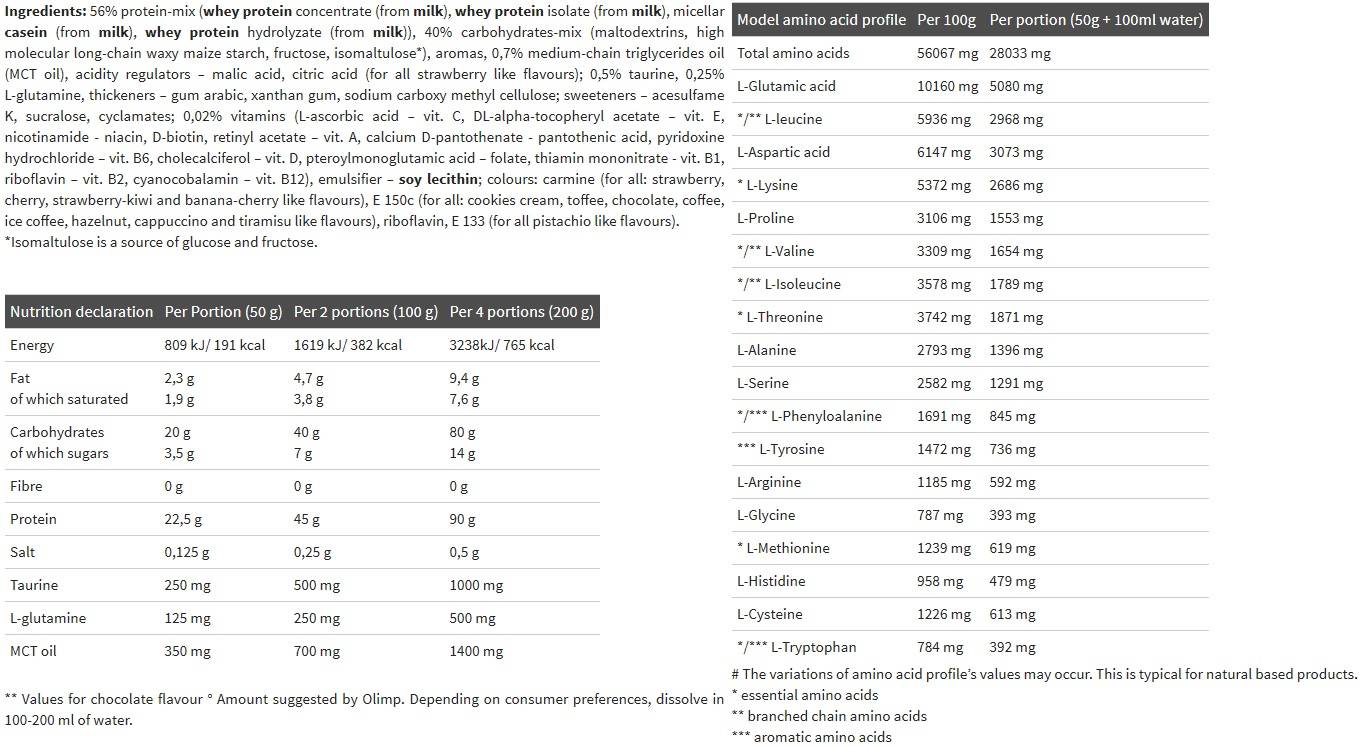 Ένας συνδυασμός πρωτεΐνης (συμπύκνωμα πρωτεΐνης ορού γάλακτος, μικκυλιακή καζεΐνη, απομονωμένη πρωτεΐνη ορού γάλακτος και υδρόλυμα πρωτεΐνης ορού γάλακτος) και υδατανθράκων σε αναλογία 50:50.