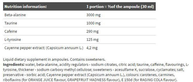 Συνιστώμενη χρήση: 1 μερίδα την ημέρα = ½ της αμπούλας (30 ml), περίπου 30 λεπτά πριν από την προπόνηση. Ανακινήστε πριν από τη χρήση. Μία αμπούλα περιέχει 2 μερίδες. Μετά το άνοιγμα, φυλάξτε στο ψυγείο και καταναλώστε εντός 48 ωρών.