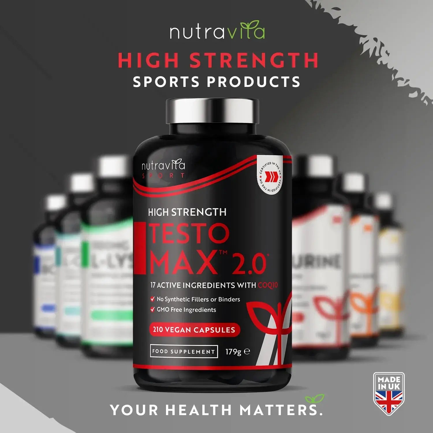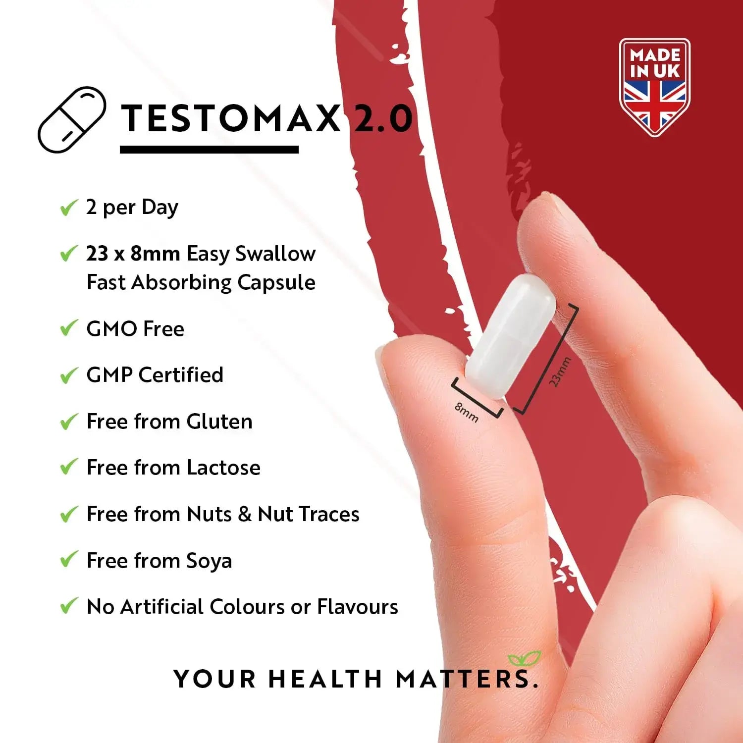 Το TESTOMAX™ 2.0 είναι μια καινοτόμος φόρμουλα που συνδυάζει ισχυρά συστατικά, σχεδιασμένη να βοηθά στη φυσική αύξηση της τεστοστερόνης και στη βελτίωση της συνολικής σωματικής και σεξουαλικής σας υγείας. Με προσθήκη Ασβαγκάντα ​​KSM 66® , CoQ10 και Εκχύλισμα μάκα , αυτό το προϊόν είναι ιδανικό για όποιον θέλει να επιτύχει βέλτιστη απόδοση.